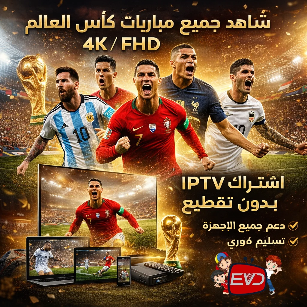 يُعدّ سيرفر EVD TV وجهتك المثلى لمتابعة كأس العالم FIFA 2026 الذي سيُقام في الولايات المتحدة وكندا والمكسيك. ستتمكن من مشاهدة جميع مباريات البطولة لحظةً بلحظة بجودة 4K Ultra HD مع تعليق عربي وإنجليزي وبلغات متعددة. لا تفوّت أي لحظة حاسمة أو هدف تاريخي؛ EVD TV يضمن لك أفضل تجربة مشاهدة لأكبر حدث رياضي في العالم. سواء كانت مباريات المجموعات أو الأدوار الإقصائية أو النهائي الكبير، يوفر اشتراك EVD TV تغطية كاملة وشاملة تجعلك تعيش الأجواء الاستثنائية كأنك داخل الملعب.
